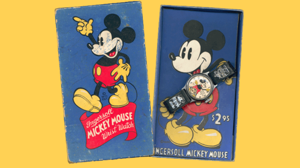 Parce qu’aucune industrie n’a su lui résister, l’horlogerie s’approprie la mythique souris en 1933. C’est la société américaine Ingersoll Watch qui lance la « Mickey Watch Mania ». La star du premier dessin animé moderne a séduit des millions d’américains avec sa joie de vivre pendant les premières années de la Grande Dépression. En 1933, Mickey Mouse Magazine apparait aux Etats-Unis, Mickey se décline alors en une multitude d’objets dérivés. Pour la firme américaine c’est évident : oser une montre avec la mascotte de Walt Disney c’est la fortune annoncée.