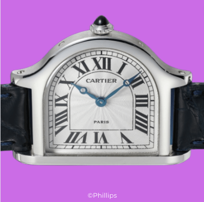 Lors de cette vente inédite, 3 exemplaires de la mythique « Cloche » seront présentés. Deux pièces uniques en platine sont créées spécialement par Cartier pour cette vente sans précédent. L’une avec un cadran figurant les lettres C.A.R.T.I.E.R.P.A.R.I.S. pour les index, et l’autres avec des chiffres romains. C’est ce dernier exemplaire qui fut présenté en vente le 6 novembre par Phillips.