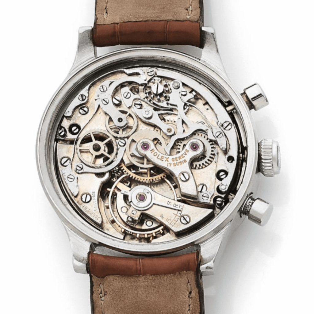 Estampillé » Rolex Watch Company Limited « , son boîtier monobloc en fait une pièce de collection à part dans l’univers des chronographes Rolex. Lancé en 1939, le modèle restera en production moins de 10 ans. L’exemplaire présenté porte sur son cadran une double signature particulièrement rare et excitante pour tous les collectionneurs : » Rolex – Bücherer’s « . Matérialisant une amitié de longue date entre deux géants de l’horlogerie, la manufacture Rolex et le mythique revendeur de Lucerne. Durant la période des années folles, Bucherer s’affirme en Suisse et en Europe comme l’une des plus belles adresses du luxe. Proposant des montres et des bijoux signés des plus grands noms de l’horlogerie et de la joaillerie, Bücherer s’attire une clientèle fortunée et élitiste. Cette solide réputation va séduire Hans Wildorf, qui cherche dès les années 1920, à accroître la visibilité de sa jeune marque de montres. En 1924, Ernst Bucherer, qui a succédé à son père Carl F. Bucherer à la tête de l’entreprise, signe un partenariat avec Hans Wildorf. Bücherer devient alors l’un des premiers revendeurs officiels de Rolex.