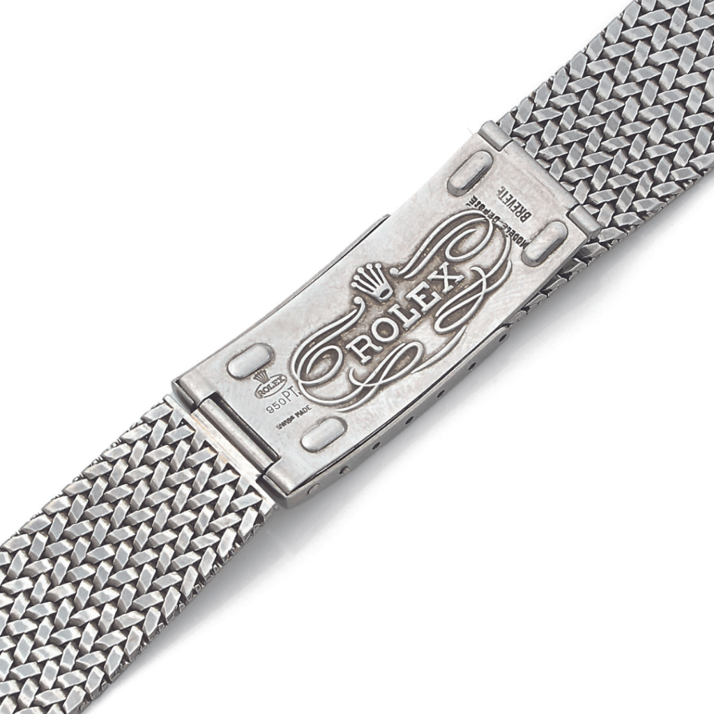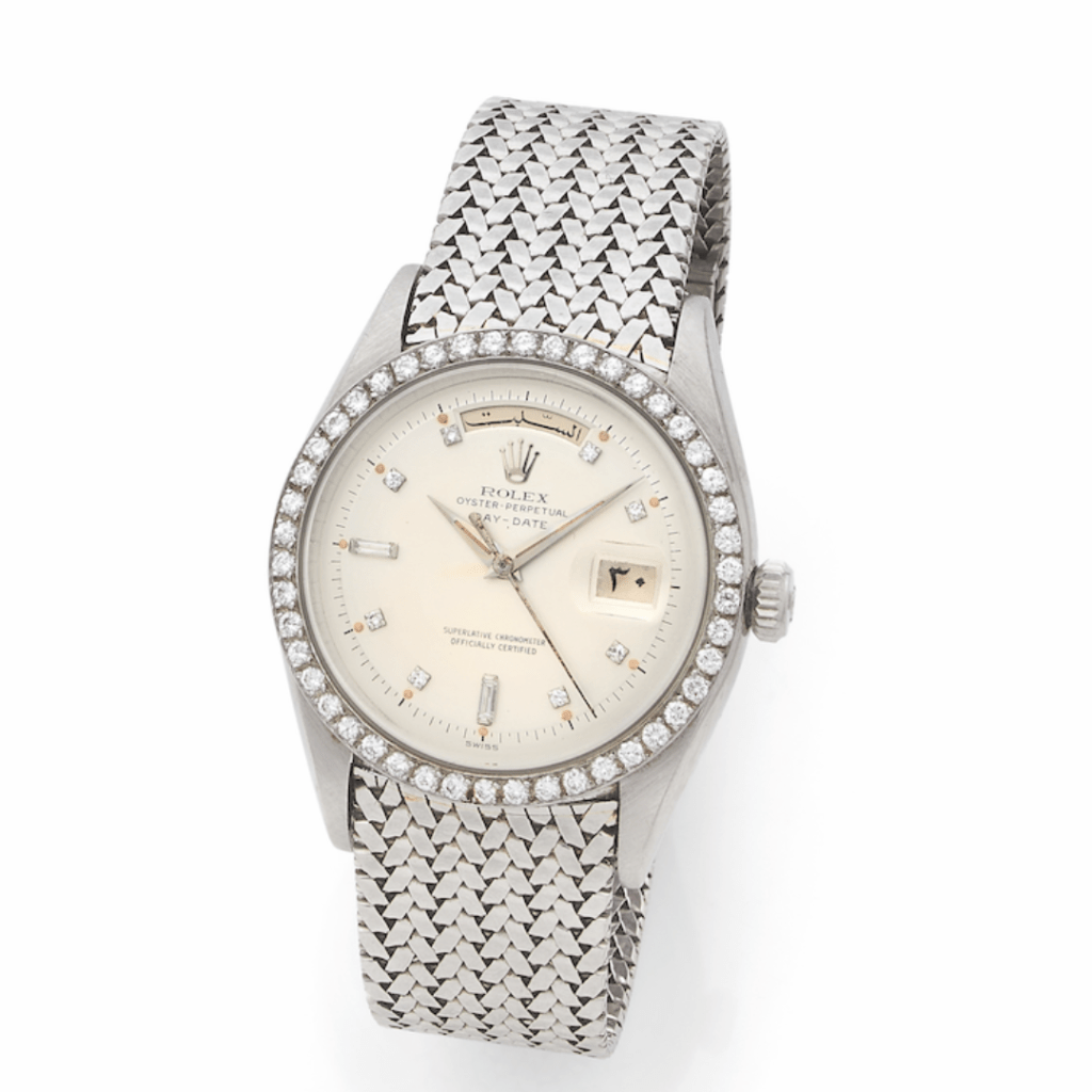 Au moins deux références équivalentes auraient été présentées aux enchères ces dernières années. Offerte au Premier ministre libanais, Rachid Karamé, par le roi d’Arabie Saoudite Saoud ben Abdelaziz Al Saoud, cette pièce de collection sans égal est présentée pour la première fois en vente publique. Montée sur un bracelet en platine avec boucle déployante dite « Big logo », cette montre est une pièce atypique dans la production Rolex.
