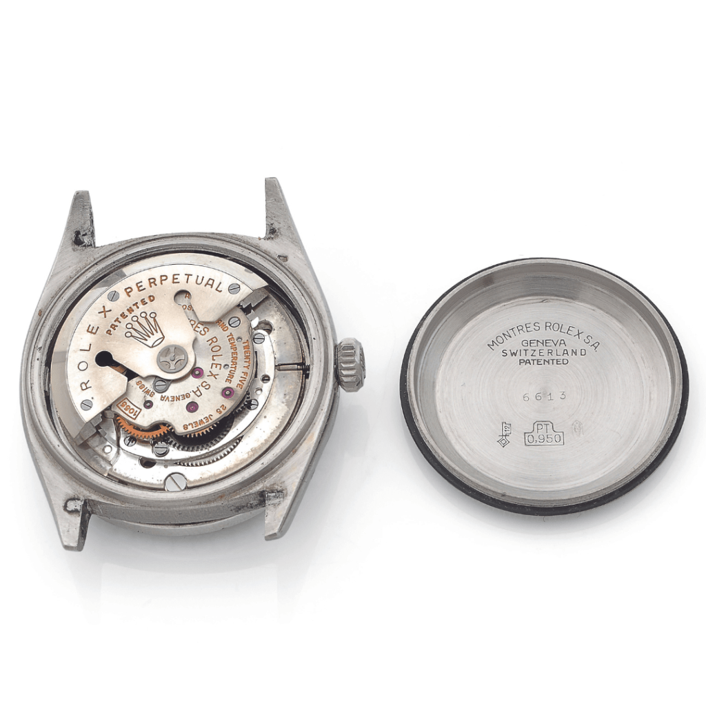 Introduite en 1957, la référence 6613 est l’une des plus rares montres produites par Rolex. Commercialisée exclusivement en platine, seuls quelques rares exemplaires ont été livrés sur le marché. Cet exemplaire, équipé d’un calendrier perse arabe oriental, est à première vue similaire à la montre illustrée dans le livre de John Goldberger » 100 Superlative Rolex Watches « , (Édition Damiani Libri, 2008, p. 163). Or, la montre présentée à la vente porte la référence 6613B, une déclinaison beaucoup plus rare.