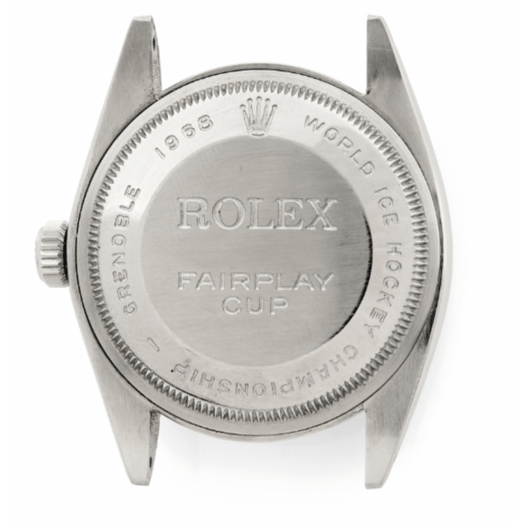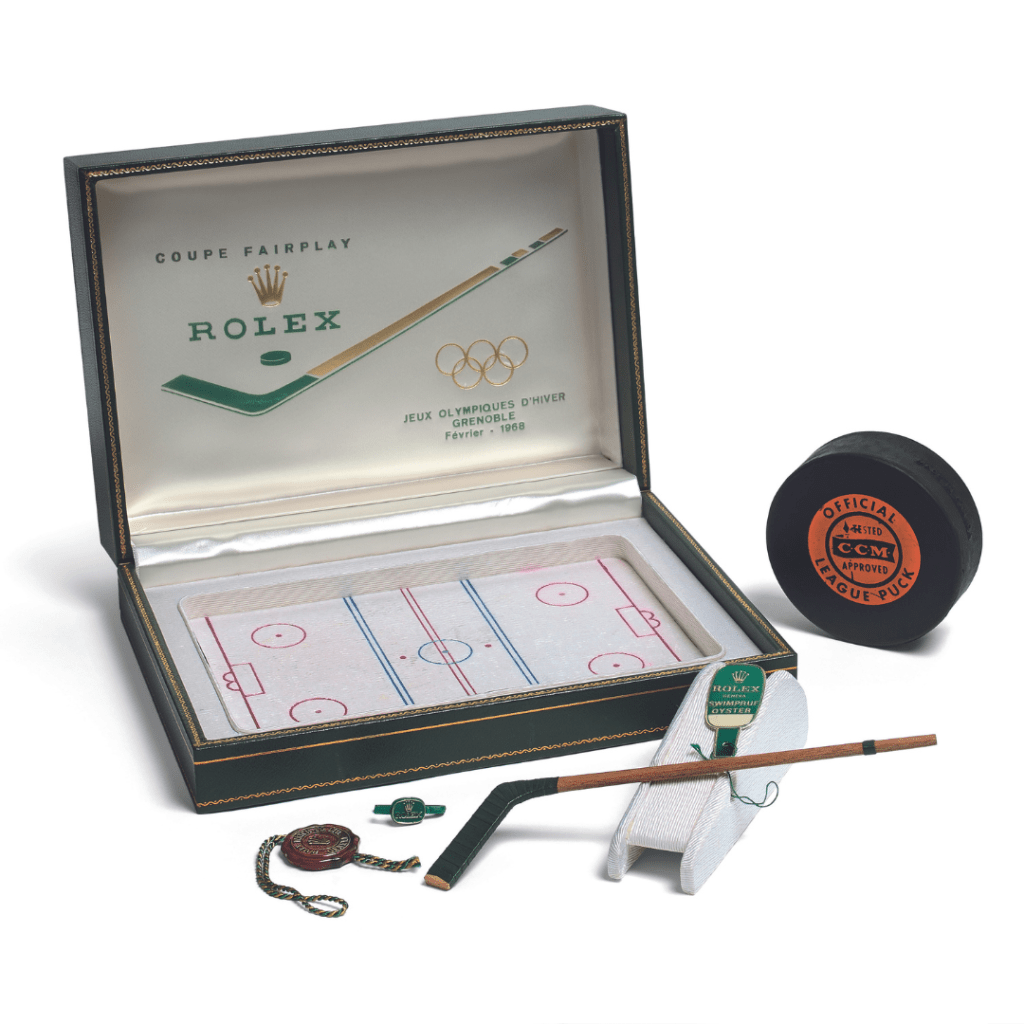 Sur fond de Printemps de Prague, les affrontements entre les équipes d’URSS et de Tchécoslovaquie devaient être parmi les rencontres les plus intenses de l’histoire des Jeux Olympiques. Dans ce contexte de tension particulier, Rolex, partenaire de l’événement, soutient les épreuves avec un prix spécial : la » Rolex Fairplay Cup « . Lancée en 1963, lors du championnat du monde de Hockey sur glace, ce prix spécial récompense l’équipe qui totalise le moins de minute de pénalisation durant la compétition. Accompagnée d’un écrin particulièrement original, représentant une patinoire de hockey sur glace comprenant une canne miniature et un véritable puck, cette montre est un collector insolite.