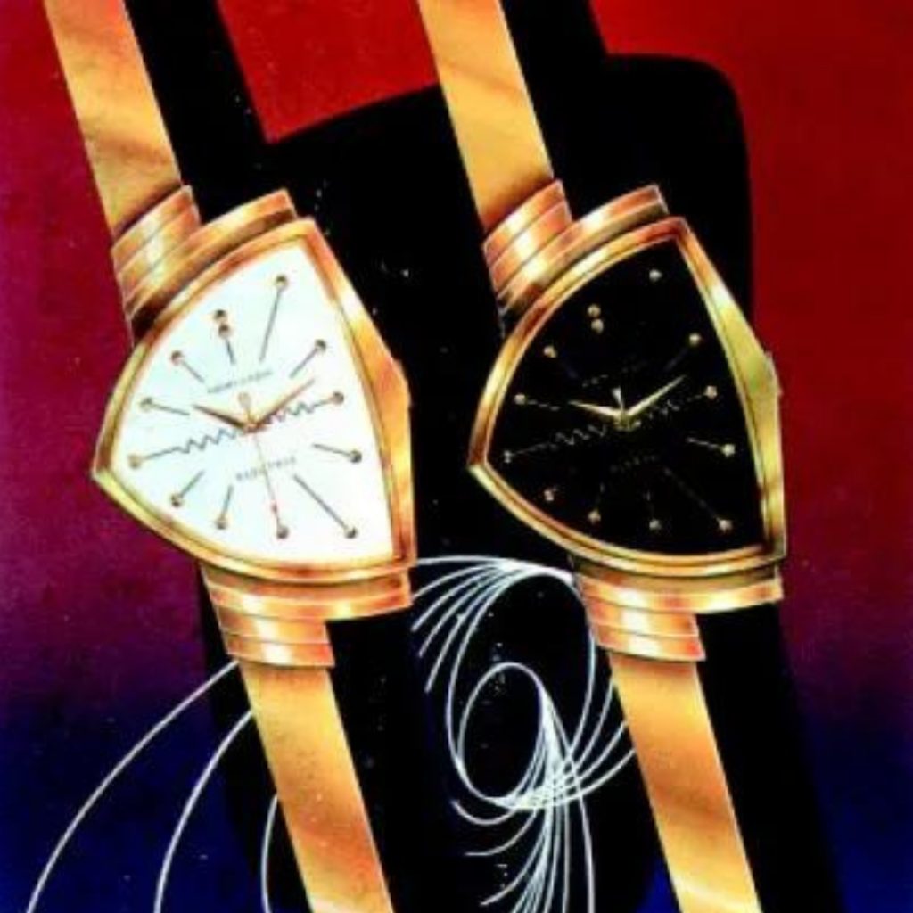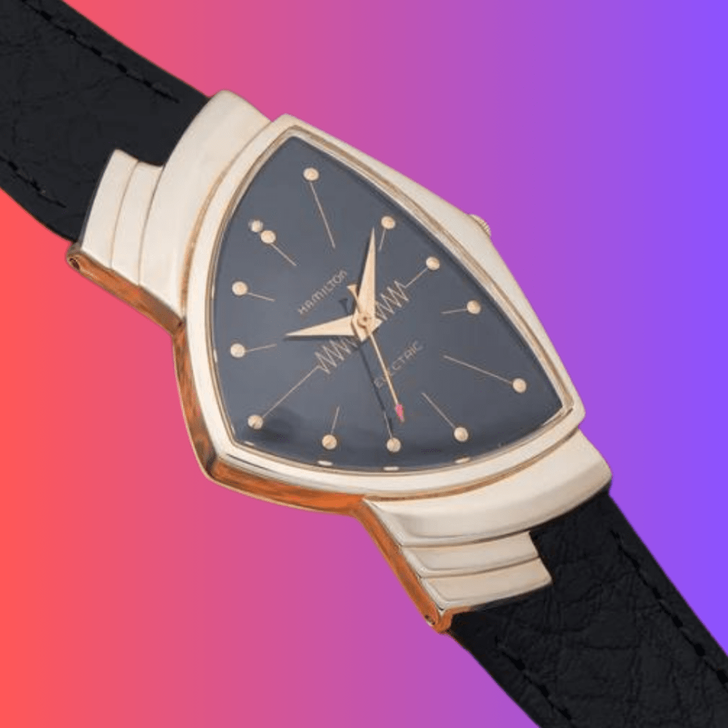 Dans le domaine des montres asymétriques, la maison américaine Hamilton a clairement été précurseur. En 1957, la marque lance son modèle Ventura, une montre qui casse les codes avec un design subversif ! Connu pour ses collaborations avec de grands noms de l’industrie automobile et ses créations ultra-futuristes, le designer Richard Arbib va imaginer cette montre visionnaire. Équipé d’un mouvement quartz, le modèle est aussi stylé qu’accessible et connaît un succès fulgurant. Elvis Presley en sera le meilleur ambassadeur, puisqu’il craque immédiatement sur ce design atypique et en fera sa montre « de tous les jours ». Si le King apparaît dans le film « Blue Hawaii » avec ce garde-temps au poignet en 1961, le modèle connaît un retour de hype en 2019 grâce au film « Men in Black ». Toujours au catalogue de la marque, les modèles vintage sont aujourd’hui des pièces iconiques que les amateurs peuvent s’offrir aux enchères ; les prix oscillent généralement entre 1 500 et 3 500 €.