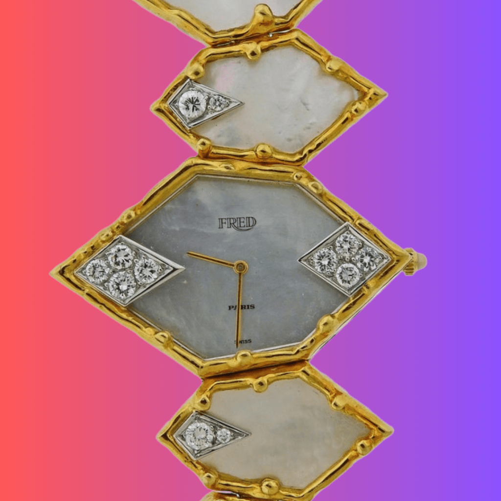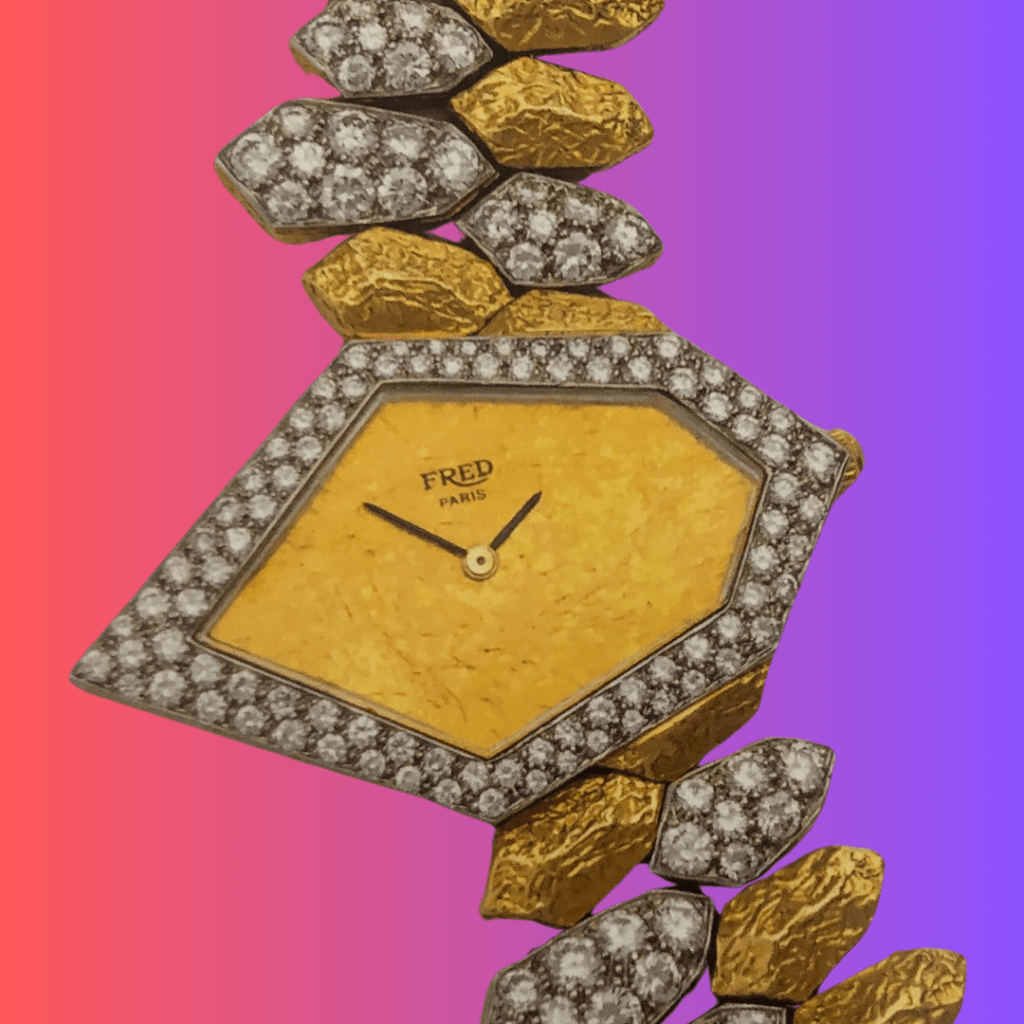Dès 1969, le designer Gerald Genta, à qui l’on doit des montres cultes comme la Royal Oak dessinée pour Audemars Piguet ou la Nautilus créée pour Patek Philippe, entame un partenariat avec le joaillier Fred. Durant 20 ans, Gerald Genta va réaliser pour le créateur parisien tous les modèles horlogers. Si l’on retrouve le « style Genta » dans les collections masculines, la collection « Pépites » est indiscutablement l’une des lignes féminines les plus irrésistibles et réussies. Si son design sculptural, à l’allure seventies, est juste sublimissime, c’est un modèle vintage particulièrement difficile à trouver.