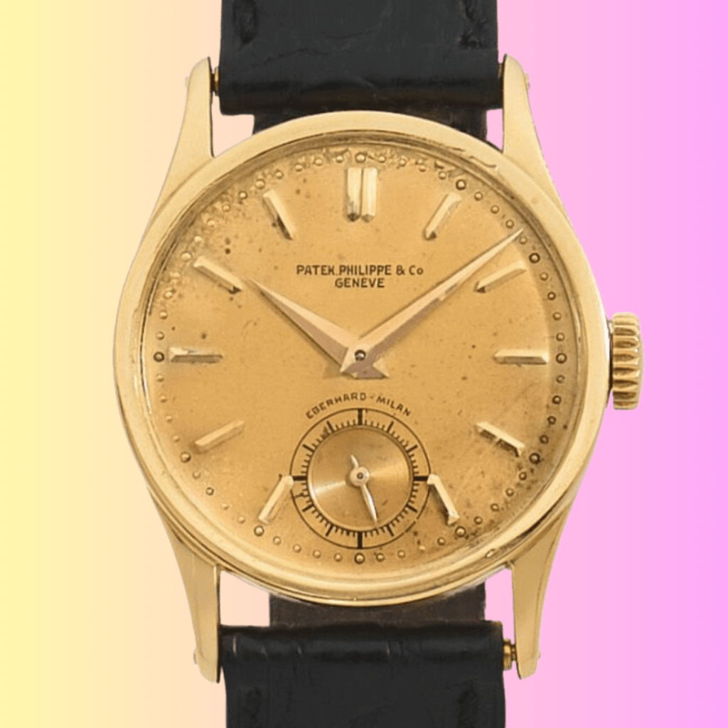 Double-signature peu courante, Eberhard Milan a distribué durant le 20e siècle les plus grandes manufactures suisses, notamment Patek Philippe, Jaeger-Lecoultre ou Audemars Piguet. Malgré son cadran qui présentait plusieurs défauts, cette Calatrava « première référence », dont le boîtier portait la marque du fabricant Antoine Gerlach, s’est vendue 6 650€. Le 7 novembre 2020, la maison Phillips a vendu un exemplaire en acier de la fameuse Calatrava 96 avec double signature « Eberhard Milan ». Dans la notice du catalogue, les spécialistes annonçaient qu’il s’agissait du premier exemplaire de Calatrava répertorié avec la double signature Eberhard Milan. La maison Aguttes a donc découvert le deuxième exemplaire !