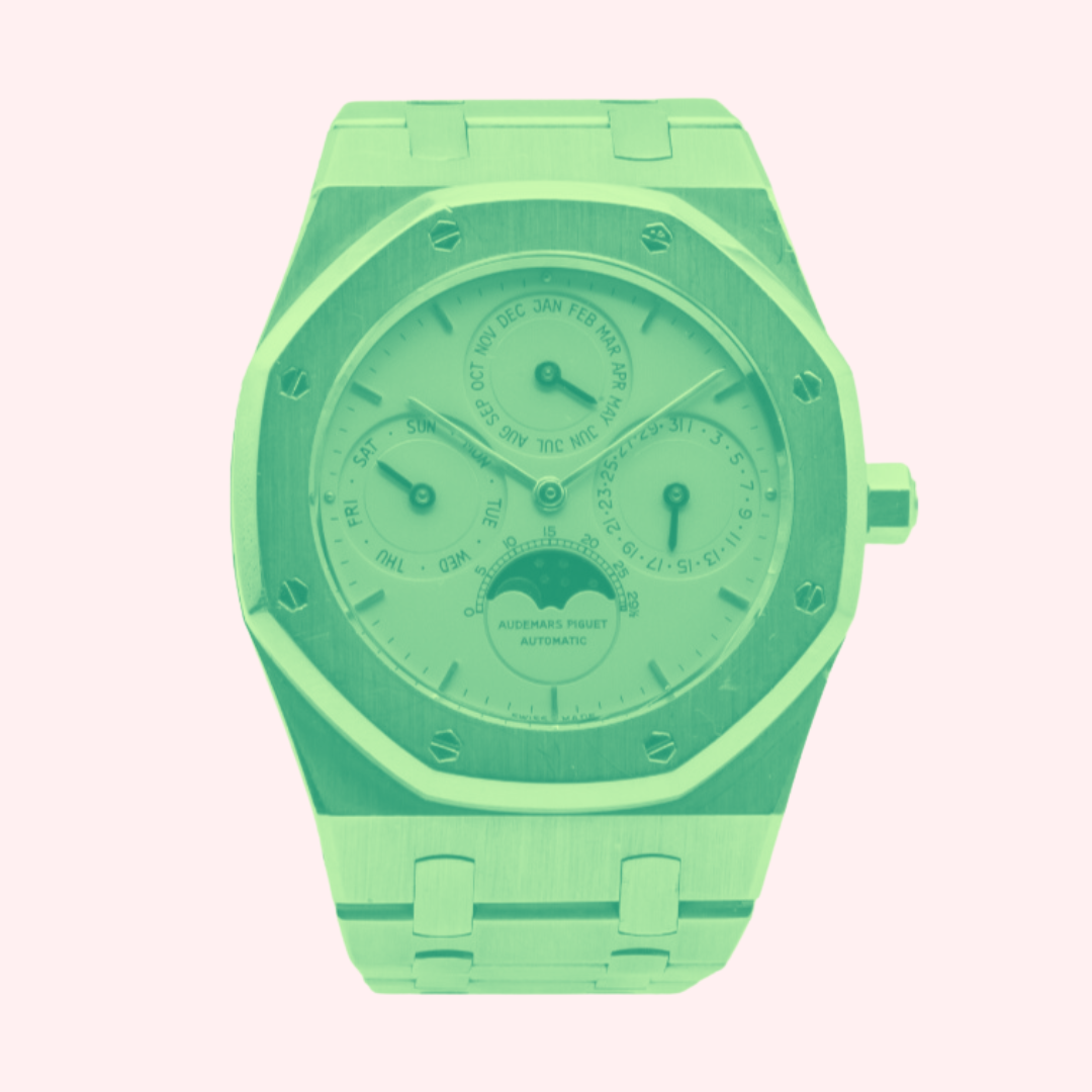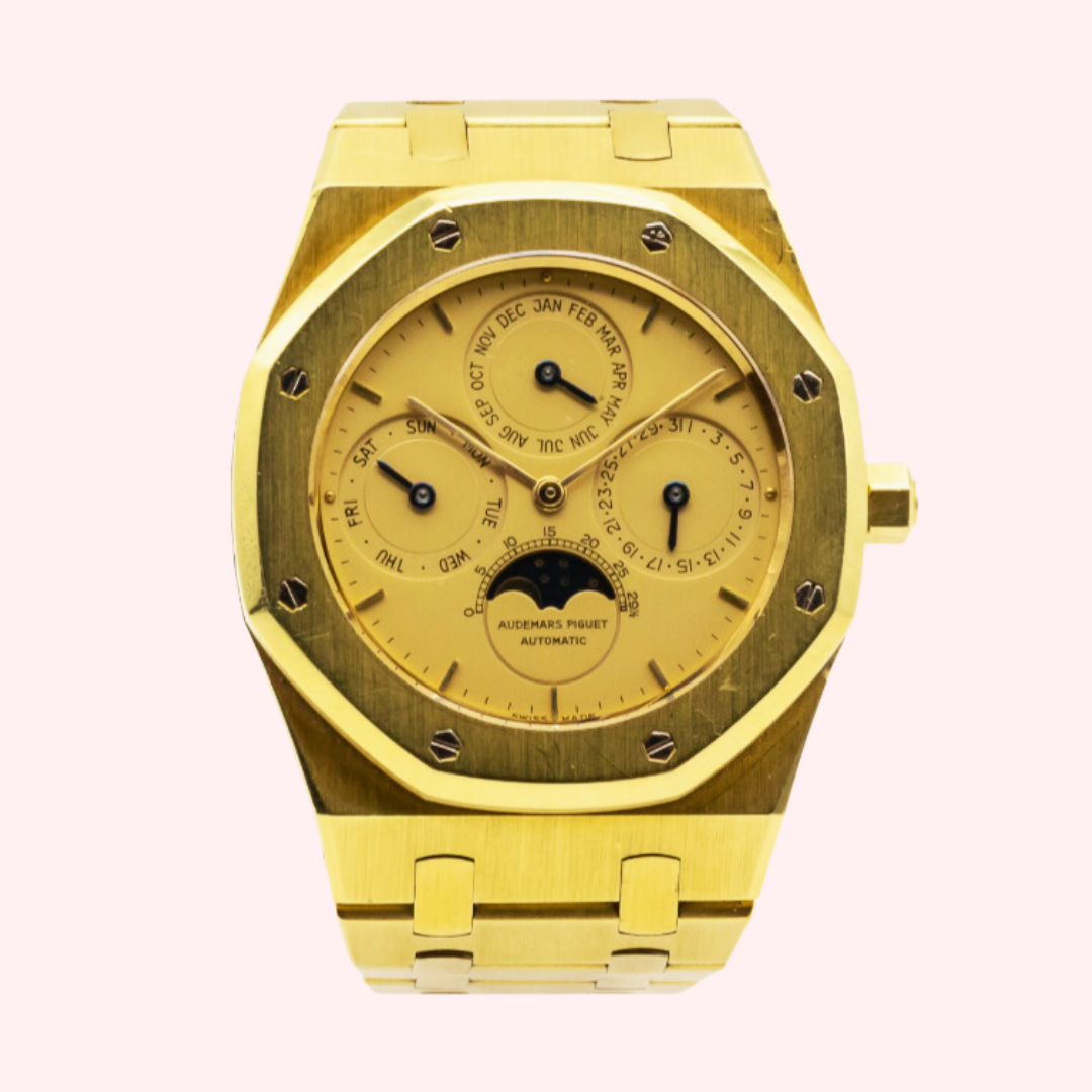 En 1978, Audemars Piguet pousse la prouesse technique encore plus loin en lançant le premier quantième perpétuel automatique extra-plat. S’affirmant désormais comme « spécialiste » de cette complication, la manufacture du Brassus intègre dans les années 1980 cette complication à sa collection iconique : Royal Oak. La première Royal Oak avec calendrier perpétuel fut introduite en 1984 dans les collections Audemars Piguet. Si les premiers exemplaires sont exclusivement produits en acier, il faut attendre 1987 pour voir apparaître la première Royal Oak QP en or jaune. Produit sous la référence 25654, ce modèle fut commercialisé jusqu’en 1998. D’après les archives d’Audemars Piguet, seulement 851 exemplaires auraient été manufacturés.