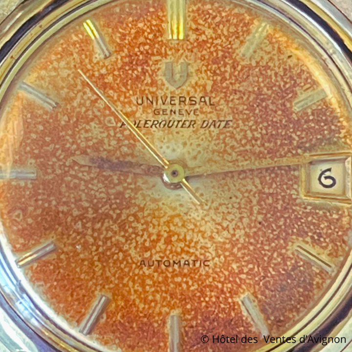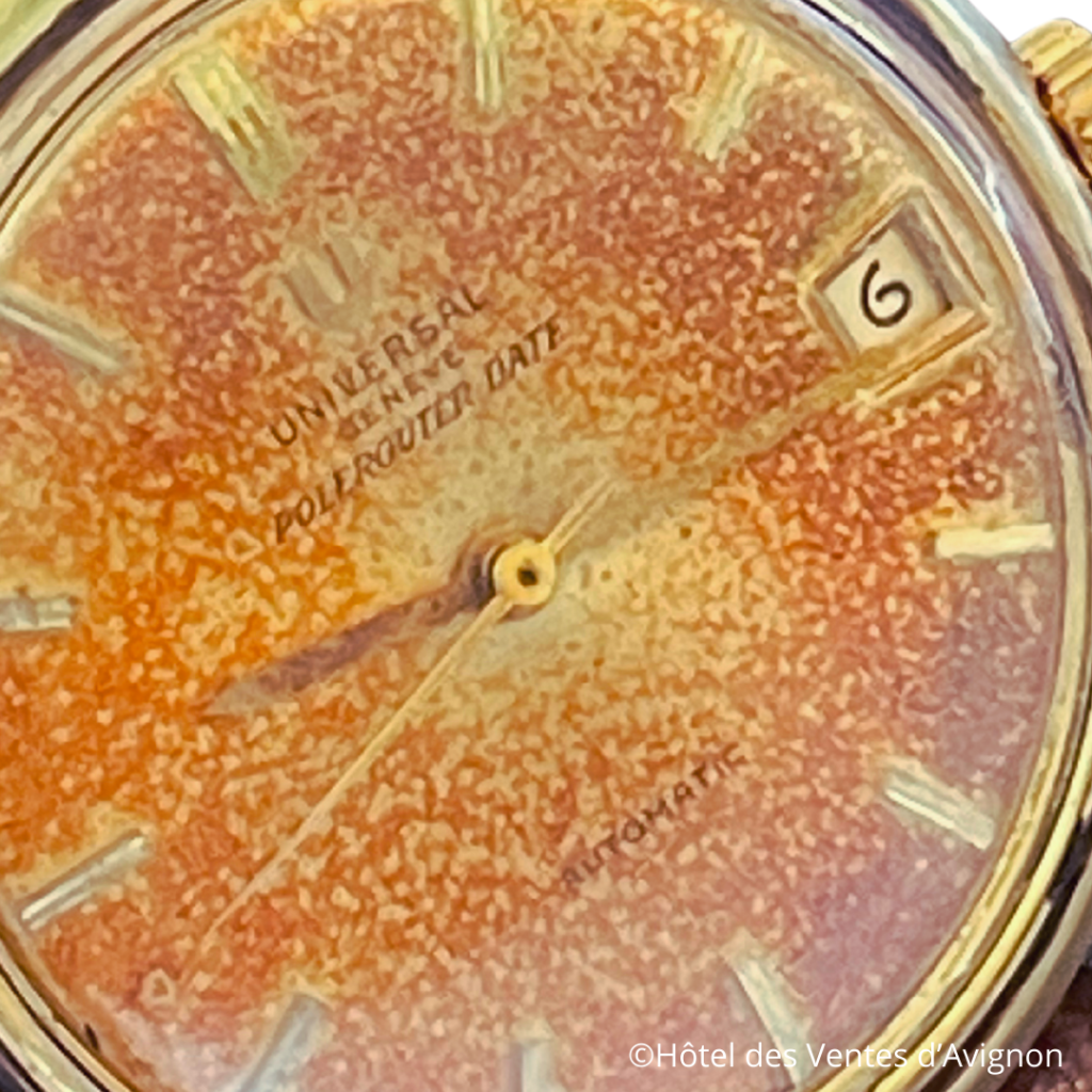 Une altération de la peinture du cadran peut survenir suite à une exposition à l’humidité, et le risque est de constater un décollement de la matière. Mais lorsque la peinture « résiste » et conserve son adhérence, une surprenante décoloration peut apparaître, donnant alors à la montre un tout autre aspect. Le modèle Polerouter signé Universal Genève qui sera présenté en vente le 7 décembre prochain à l’Hôtel des Ventes d’Avignon est un parfait exemple. Produit dès le milieu des années 1950, la Polerouter fut développée par Universal Genève pour la Scandinavian Airline System. En 1952, un nouveau couloir de vol est ouvert entre Los Angeles et Copenhague en survolant le pôle nord. Or, les champs magnétiques du pôle interfèrent avec tous les instruments de précision. L’enjeu pour Universal Genève est donc de développer une montre capable de résister aux variations provoquées par les champs magnétiques. La conception est confiée à un jeune designer dont c’est le premier vrai projet : Gerald Genta, un nom qui deviendra mythique dans l’histoire du design horloger. Avec une estimation de 800 / 1.200€, cette pépite est une belle opportunité pour tous les amateurs désirant s’offrir une montre culte avec une patine singulière.