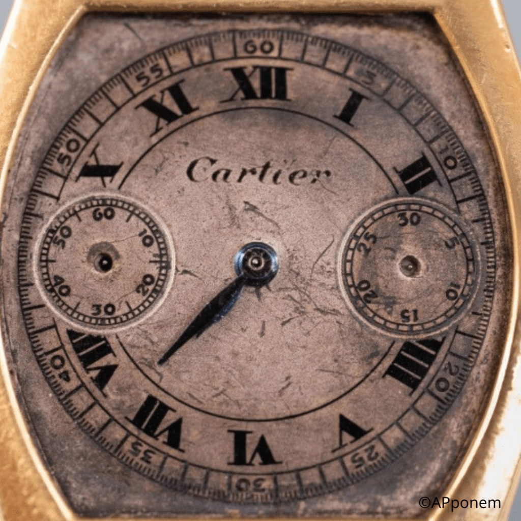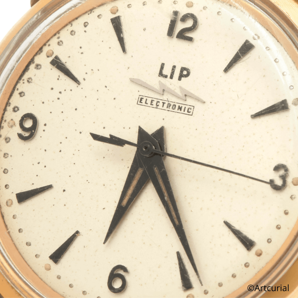 L’humidité, lorsqu’elle ne provoque pas une décoloration totale du cadran, peut provoquer une corrosion par piqûre du vernis. Le 16 décembre prochain, la maison Artcurial présentera lors d’une vente exceptionnelle intitulée « De Gaulle, une succession pour l’histoire » un modèle signé Lip présentant cette patine si particulière. Le cadran, tacheté de points noirs, donne à cette pièce beaucoup de caractère. Au-delà de l’esthétique, ce défaut dans la matière rend aussi cette montre particulièrement identifiable. Présentée pour la première fois en vente aux enchères, cette montre provient de la succession de l’Amiral Philippe de Gaulle, le fils du Général de Gaulle décédé le 13 mars dernier à l’âge de 102 ans. Si cette montre réapparaît dans quelques années sur le marché, il est clair que la patine si atypique de son cadran permettra de la distinguer. Estimée 6.000 / 8.000€, cette pièce historique promet déjà une belle bataille d’enchères.