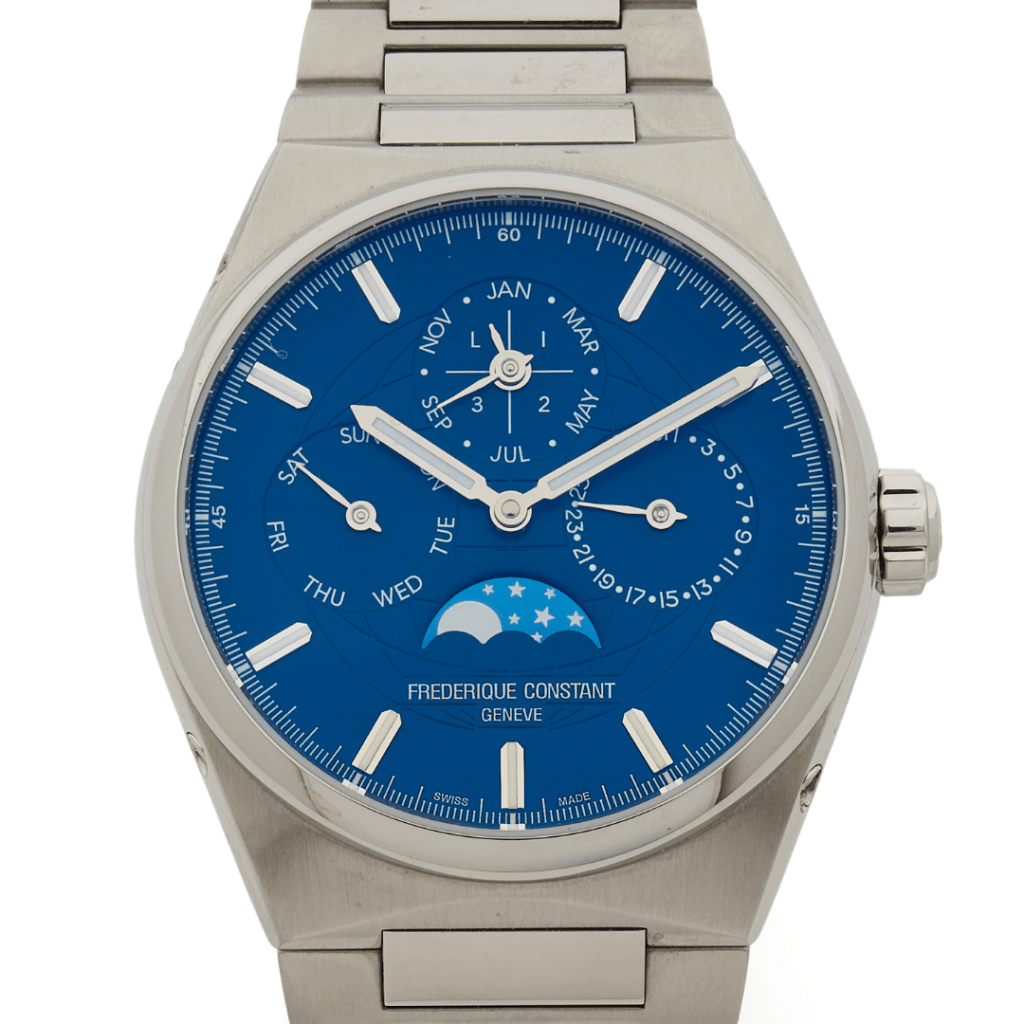 C’est la complication qui fascine indéfiniment les collectionneurs et les plus grands amateurs d’horlogerie. Comment résister à la magie d’une montre qui indiquerait à son propriétaire le jour, la date et l’état de la lune en prenant en compte les irrégularités du calendrier grégorien ? Impossible de ne pas céder à la tentation d’un mécanisme aussi ingénieux, qui en plus ne nécessite aucun ajustement durant 100 ans ! Si les Années folles furent l’âge d’or du calendrier perpétuel, il faut savoir que des années 1930 jusqu’à la fin des années 1970, Patek Philippe fut la seule manufacture à produire en série ces montres compliquées. Aujourd’hui, le calendrier perpétuel compte parmi les complications les plus nobles de l’horlogerie et se retrouve systématiquement dans la collection de tout grand amateur. Certaines signatures, comme Fredérique Constant et son modèle Highlife Perpetual Calendar ( par exemple, offrent un excellent rapport qualité-prix ( 2 500 / 3 500€). Movado se démarque également avec une série anniversaire en or jaune lancée en 1981 pour célébrer les 100 ans de la marque ( 2 000 / 3 000€).