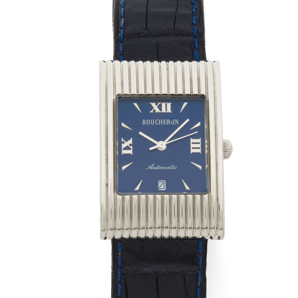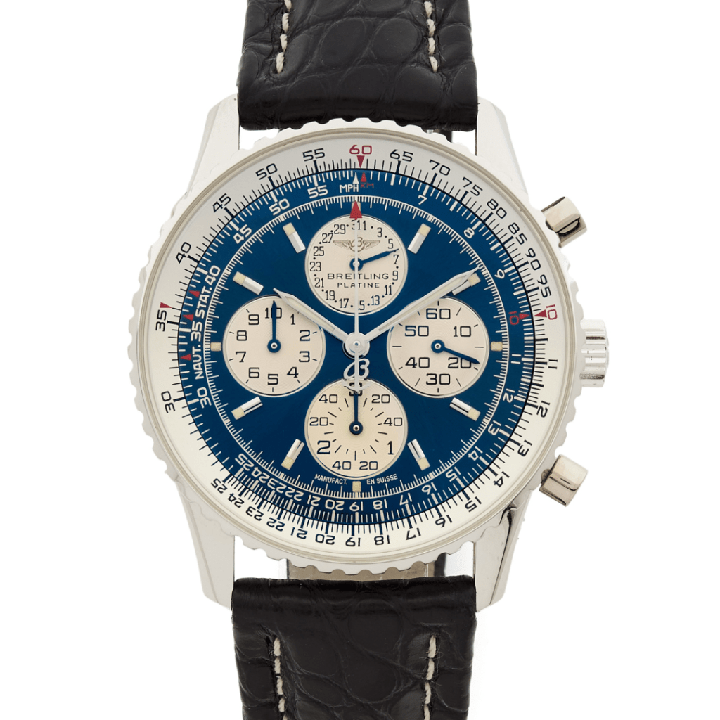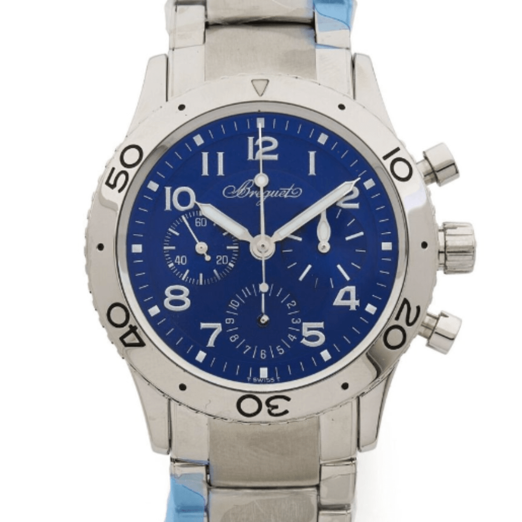 Du bleu « soleil » de Patek Philippe au turquoise « Tiffany», le bleu est aujourd’hui l’une des couleurs de cadran les plus demandées ! Offrant une alternative à la sobriété du blanc et à la profondeur du noir, la tendance des cadrans bleus s’est imposée en force depuis 2018 à l’échelle internationale. Après avoir connu une première vague de popularité dans les années 1970, le bleu est de nouveau LA couleur qui fait définitivement l’unanimité. La raison ? Bizarrement, à la question « quelle est votre couleur préférée ? », le bleu totalise 40% à 50% de réponse en Europe, en Amérique du Nord et au Japon, ce qui en fait une des couleurs les plus faciles à vendre. En France, le bleu se classe en couleur préférée n°1 devant le vert, le rouge et le noir ; ce qui maximise les chances de retrouver dans toute collection horlogère au moins une ou plusieurs montres à cadrans bleus ! Parmi les pépites de cette vente, les amateurs retrouveront un modèle Navitimer Airbone en platine , éditée à seulement 100 exemplaires par Breitling ( 4 000 / 6 000€) ou le mythique Type XX Aéronavale de Breguet avec un cadran bleu cobalt, une série de 1 500 pièces uniquement ( 3 000 / 5 000€).