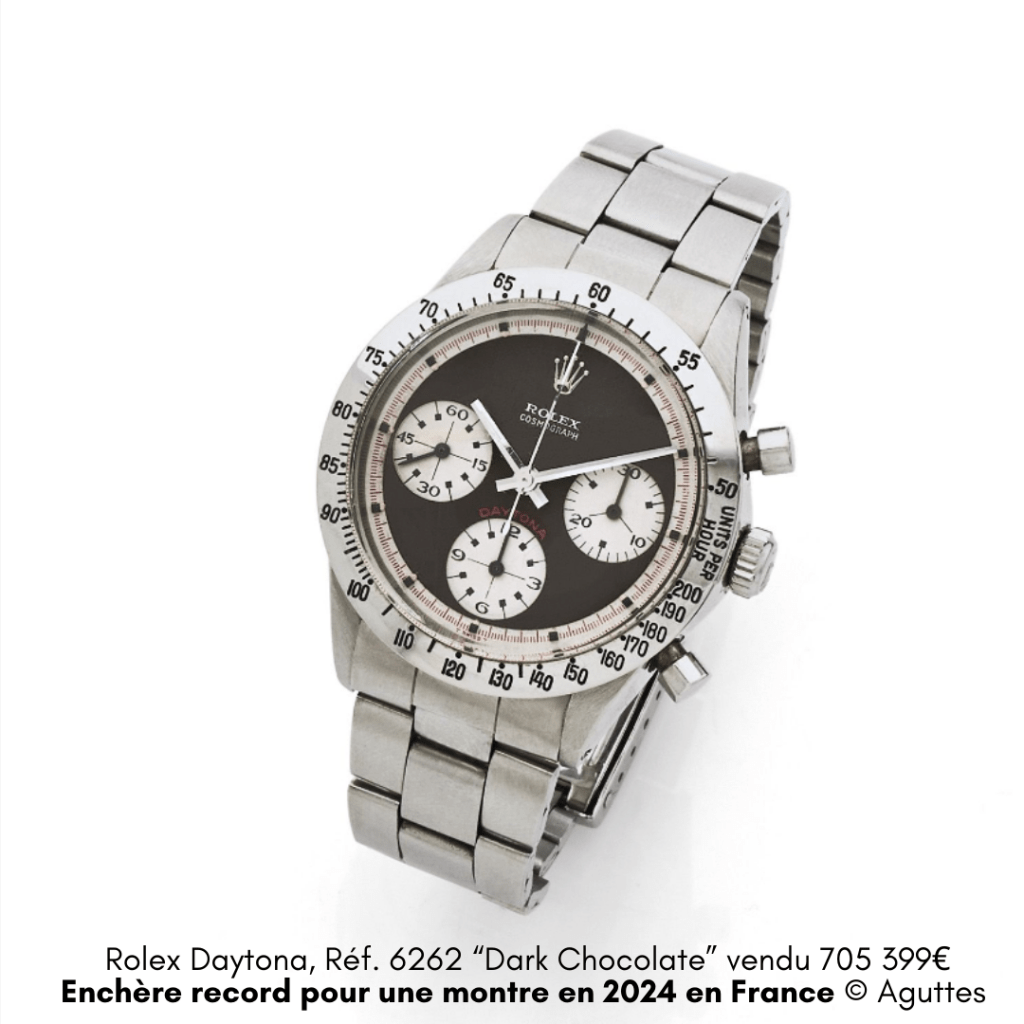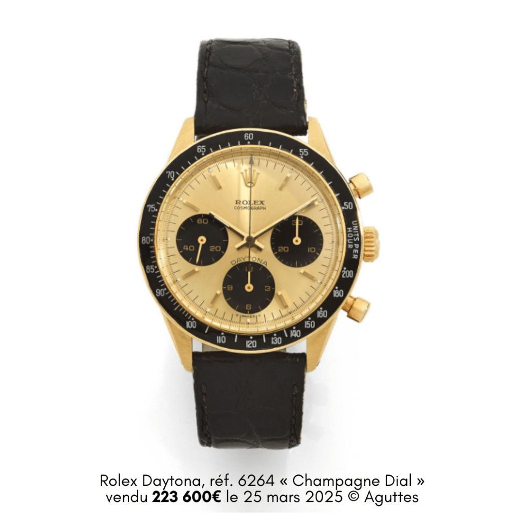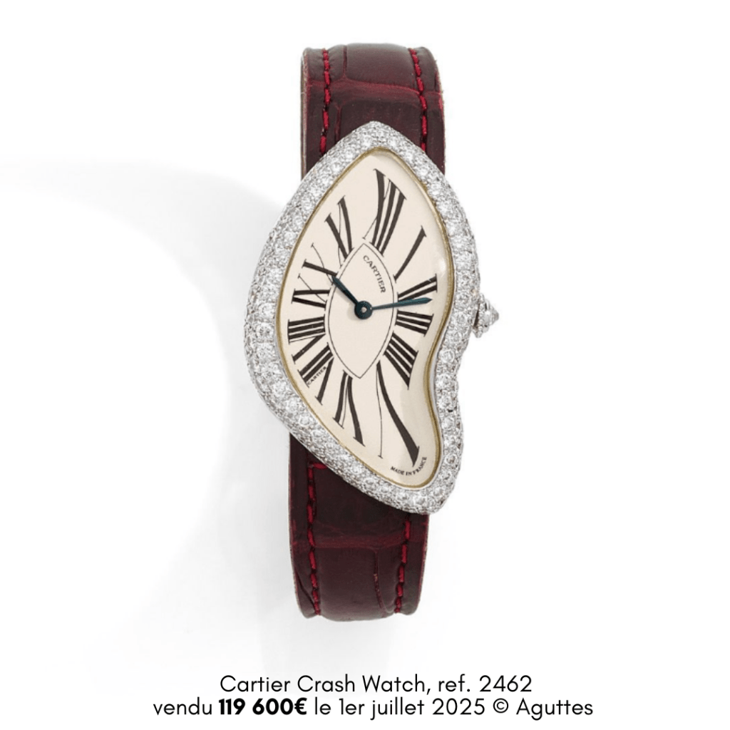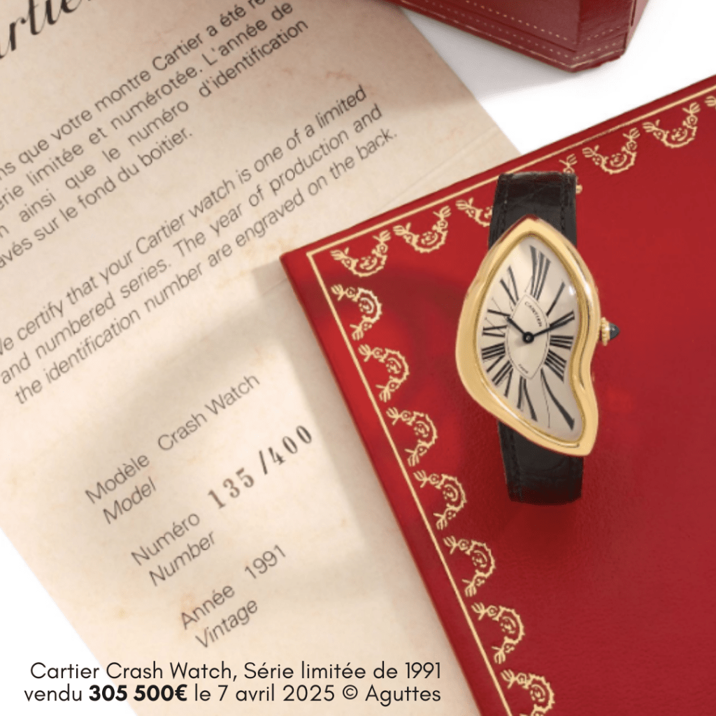 En 2024, la vente d’une montre Rolex Daytona 6262 Dark Chocolate Dial pour 705 399 € permet à Aguttes de remporter la palme de la plus belle enchère horlogère en France. L’année 2025 s’annonce déjà prodigieuse puisque sur la période janvier-juillet, Aguttes totalise un résultat de 1,8 million d’euros (frais inclus) avec plus de 300 montres présentées aux enchères, et un taux de vente de 91%. Parmi les montres les plus excitantes, la maison continue d’exceller dans la catégorie Rolex Vintage avec notamment la vente d’un Daytona 6264 Champagne Dial le 25 mars 2025 pour 223 600€. Autre belle surprise avec Cartier, et sa très rare Crash Watch, un collectible sur laquelle la maison s’est démarquée à 2 reprises. La première fois avec une Crash en or jaune provenant d’une série limitée de 400 pièces produite en 1991 et vendue 305 500€, la seconde pour une Crash en or blanc et diamants référence 2462 et vendue 119 600€ !