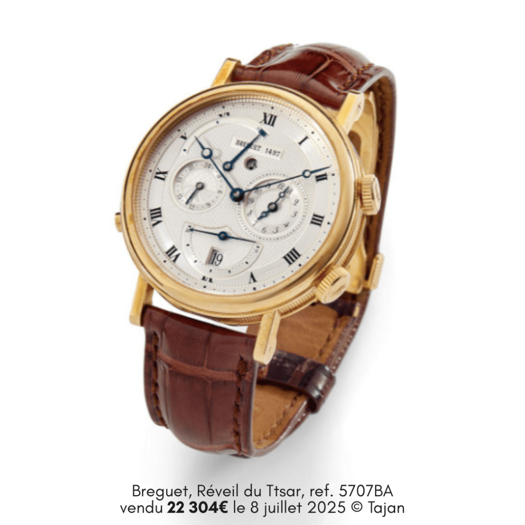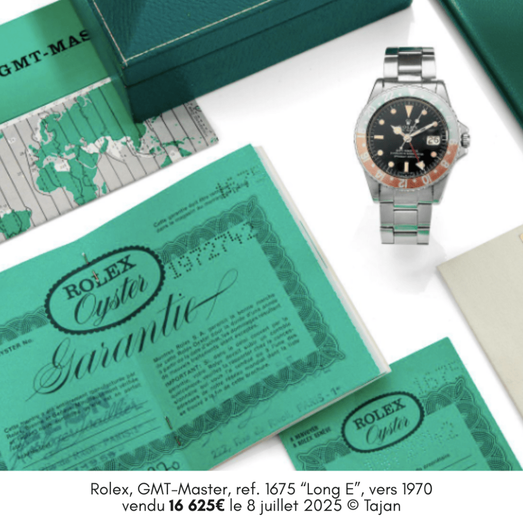Rassemblant une sélection exigeante avec des montres à la traçabilité irréprochable, Tajan fait le pari de l’ultra-select afin de capter l’attention des collectionneurs les plus exigeants. Une stratégie du Less is More qui s’avère payante puisque sur sa première vente de prestige de l’année, le 8 juillet dernier, le département a présenté 104 montres et réalisé un produit de vente de 537 920€ avec 97% de lots vendus ! Une belle performance qui s’explique par 4 critères sur lesquels Géraldine Richard ne transige jamais : l’attractivité des modèles, une provenance irréprochable, un bel état de préservation et des estimations en adéquation avec le marché. Parmi les « top lots » vendus cette année, les amateurs ont certainement remarqué la fameuse Rolex GMT-Master ref. 1975 habillée d’un cadran mat première génération « Long E ». Provenant de son propriétaire d’origine, un archéologue qui avait naturellement pris soin de conserver l’intégralité des documents Rolex d’époque, cette montre s’est vendue 16 625€. Elle avait été acquise en 1970 par son seul et unique propriétaire auprès de la bijouterie Léon, un revendeur parisien historique en activité depuis 1907. Un modèle Réveil du Tsar 5707 signé Breguet, en version or jaune et provenant d’une collection particulière, s’est vendu 22 304€, un résultat particulièrement fort en comparaison des prix généralement obtenus aux enchères pour ce modèle note Géraldine (généralement autour de 17 000€). Côté horlogerie ancienne, une pièce de la première moitié du 19ᵉ siècle signée Perrelet (Louis-Frédéric), formé auprès de Breguet, Horloger du Roi et grand inventeur, s’est également vendue 6 822€, le quintuple de son estimation !