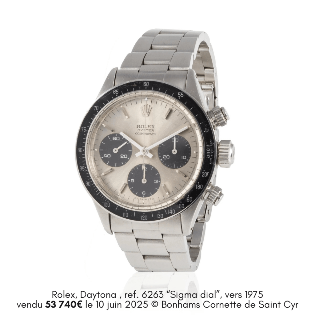 Avec 8 ventes programmées chaque année, Bonhams Cornette de Saint Cyr a orchestré 4 ventes aux enchères sur la période janvier-juillet 2025, et vendu 300 montres pour près d’un million d’euros (frais inclus). Parmi les rendez-vous les plus marquants de ce début d’année, il y eut A Curated Selection of Gerd-Rüdiger Lang’s Timeless Masterpieces, premier chapitre de la dispersion de l’immense collection du fondateur de la marque ChronoSwiss. Gerd-Rüdiger Lang est considéré comme l’un des acteurs important du renouveau de l’horlogerie mécanique après la crise du quartz. L’une de ses montres, un chronographe de dame des années 1940 (lot 3063) a d’ailleurs été acquis par le Patrimoine Universal Genève durant la vente. Parmi les plus beaux résultats, on se souvient d’un Daytona 6263 vendu 53 740€, ou encore d’un chronographe Royal Oak ref. 26240OR en or rose avec fonction flyback vendu 51 200€. Le chiffre à retenir est certainement 38 400€, un étonnant record pour une montre rare signée de l’horloger indépendant suisse Paul Gerber, connu notamment pour avoir réalisé la plus petite horloge en bois du monde et la montre la plus complexe jamais construite en termes de nombre de composants.