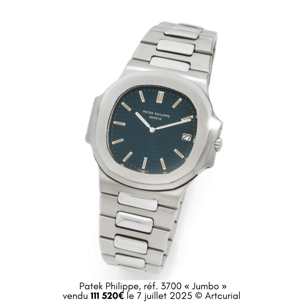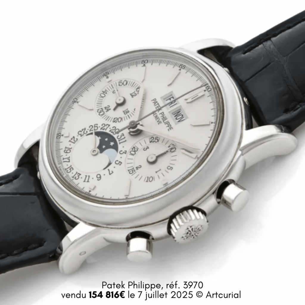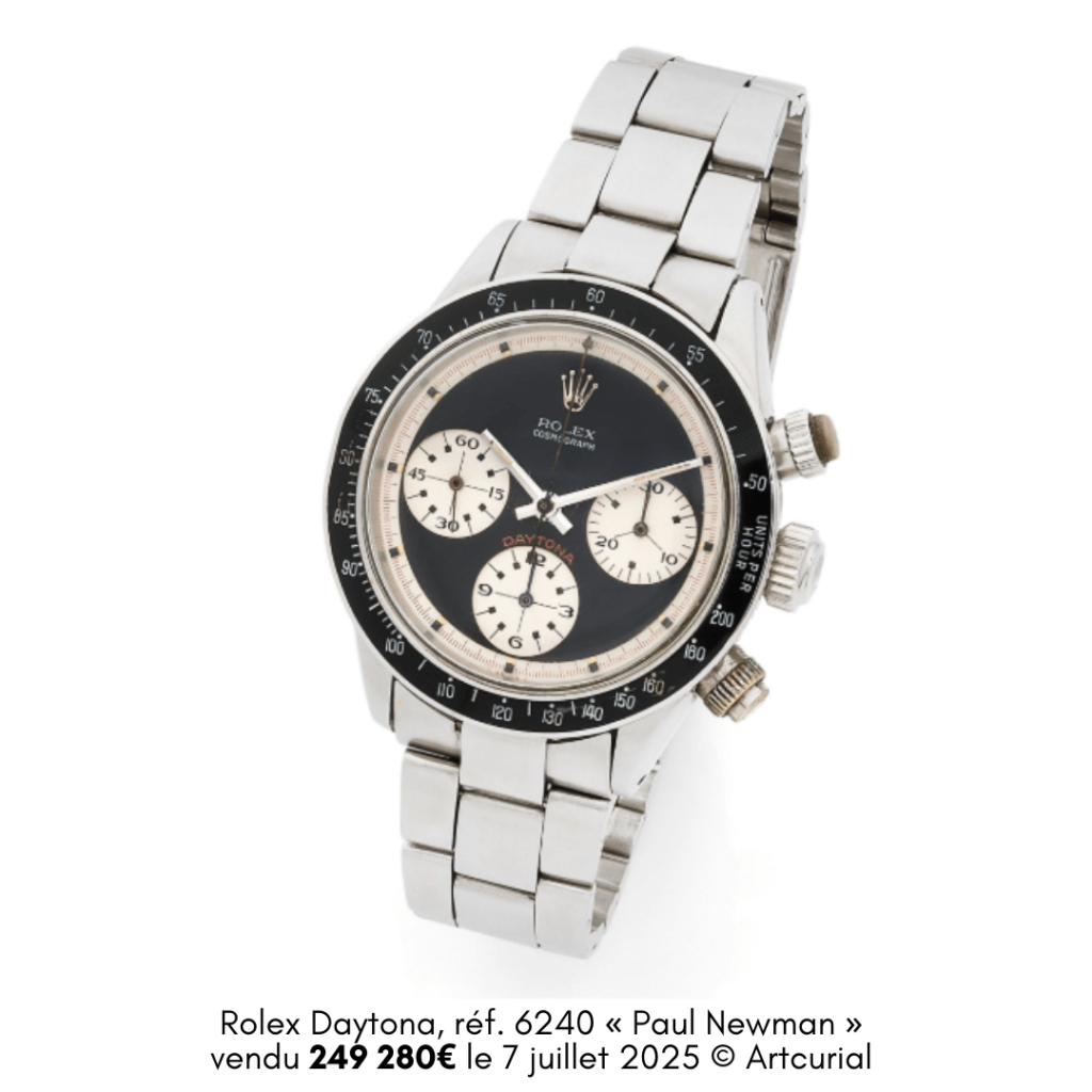 Si l’année 2024 a été marquée par la vente, pour plus d’un demi-million d’euros, d’une montre Lip ayant appartenu au Général de Gaulle, en 2025, c’est sur Rolex et Patek Philippe qu’Artcurial signe ses plus belles performances : 249 280€ pour un Daytona Paul Newman ref. 6240, 154 816€ pour un chronographe à quantième perpétuel Patek Philippe réf. 3970 en version platine, ou encore 111 520€ pour une Nautilus Jumbo 3700 en acier provenant directement de son propriétaire d’origine. Depuis le début de l’année, Artcurial a organisé 5 ventes et présenté aux enchères 315 montres, dont 70% furent vendues pour un montant total de 2,4 millions d’euros (frais inclus). À noter qu’il y a quelques années, la maison a osé se positionner audacieusement dans le secteur de l’horlogerie féminine en créant un rendez-vous dédié : le Temps est Féminin.