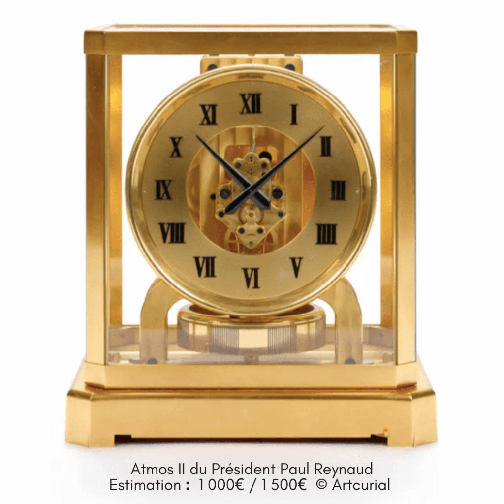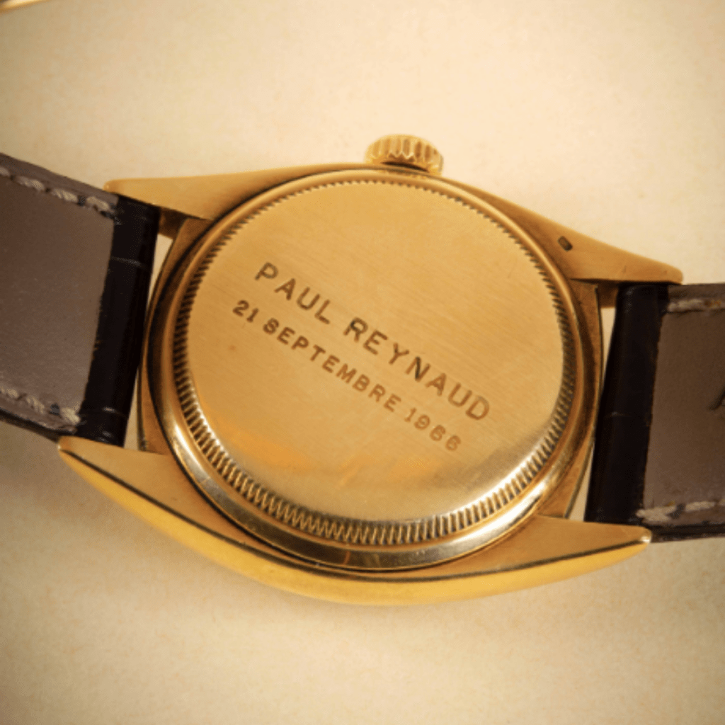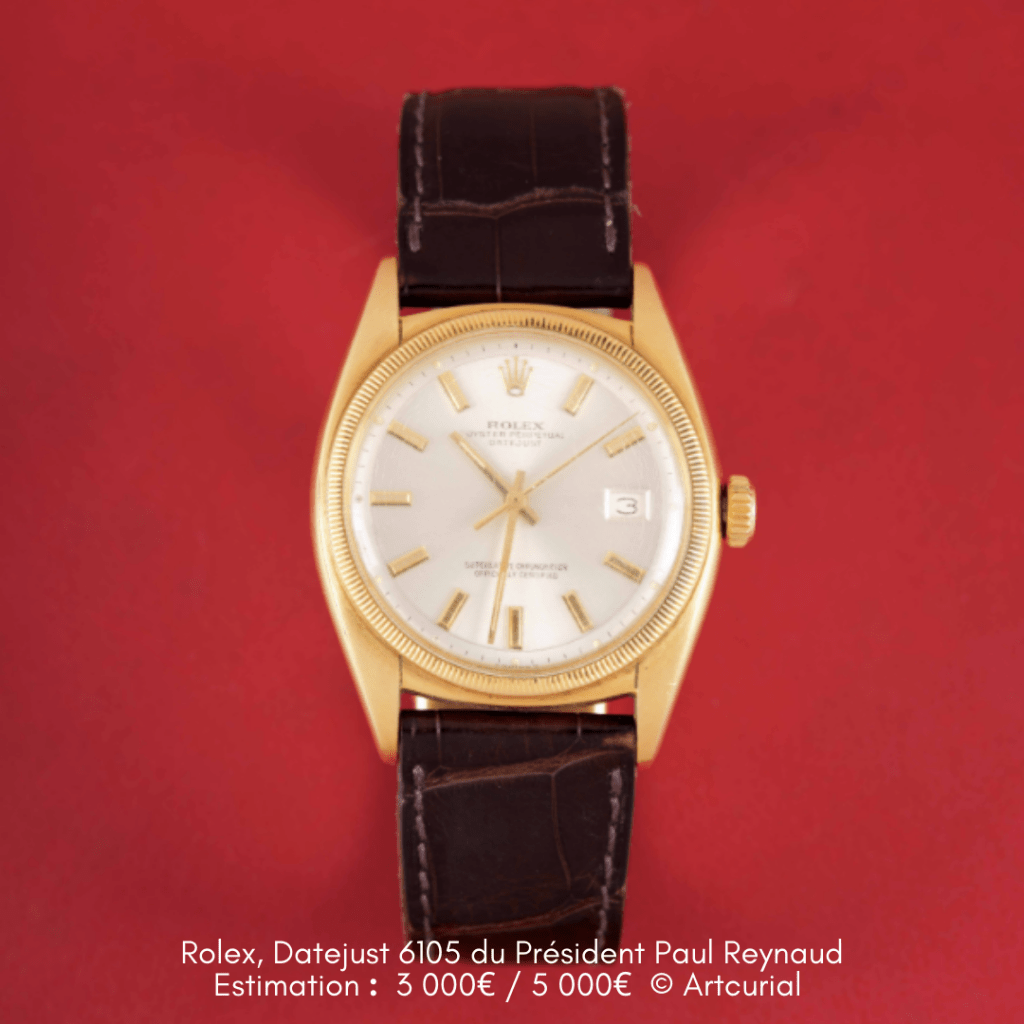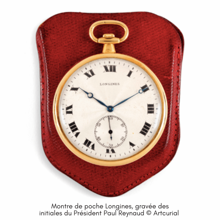 Rolex, Longines ou Jaeger-LeCoultre… plusieurs pièces signées des plus grandes manufactures horlogères et ayant appartenu à Paul Reynaud seront dispersées. Parmi les « top lot », on retrouve sa Datejust 6105 « Ovettone » en or jaune, une pendule Atmos II, produite en pleine Seconde Guerre mondiale durant l’année 1942, ou encore une montre de poche de type Lépine de 1911 décorée de ses initiales et qui fut probablement achetée auprès de Perusset & Didisheim, détaillant officiel Longines qui était alors installé au n°94 rue Saint-Lazare à Paris.