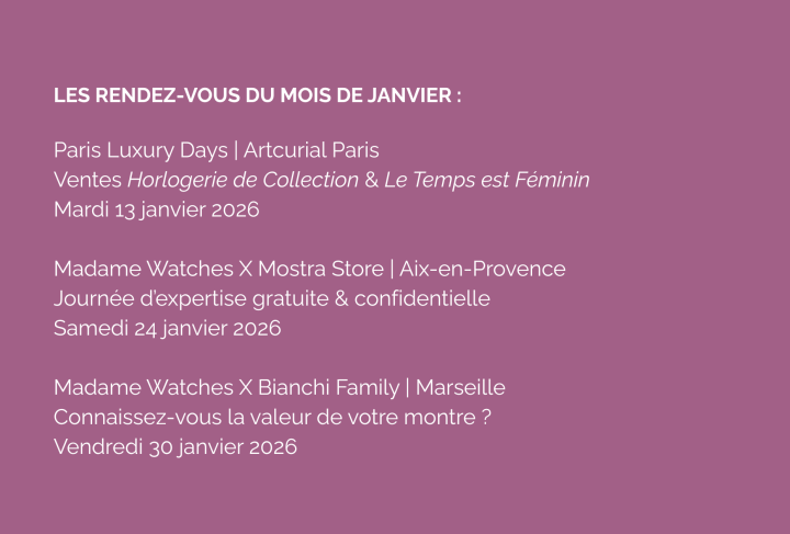 VENTES AUX ENCHÈRES Meilleurs vœux 2026 ! En savoir plus sur Madame Watches Abonnez-vous pour recevoir les derniers articles par e-mail. Saisissez votre adresse e-mail… Abonnez-vous Partager : Cliquez pour partager sur Facebook(ouvre dans une nouvelle fenêtre) Facebook Plus Cliquez pour partager sur LinkedIn(ouvre dans une nouvelle fenêtre) LinkedIn Cliquez pour partager sur WhatsApp(ouvre dans une nouvelle fenêtre) WhatsApp Cliquez pour partager sur Reddit(ouvre dans une nouvelle fenêtre) Reddit Cliquer pour envoyer un lien par e-mail à un ami(ouvre dans une nouvelle fenêtre) E-mail J’aime chargement… Similaire