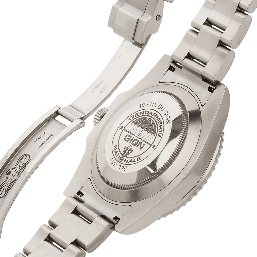 Afin de respecter le principe d’anonymat dont bénéficient les membres du GIGN, une mesure de protection essentielle compte tenu des risques liés à leurs missions, le cadran de cette Rolex Submariner 116610LN ne présente aucun signe distinctif et se confond, à première vue, avec une référence standard. C’est au dos du boîtier que l’on découvre l’élément distinctif : l’emblème du GIGN gravé, détail discret qui confère à cette montre toute sa dimension de pièce de collection. Si plusieurs exemplaires sont réapparus sur le marché ces dernières années, c’est la maison Sotheby’s qui détient à ce jour le record connu pour ce modèle, avec une adjudication de 45 600 € en 2024, pour un exemplaire provenant directement de son propriétaire d’origine.