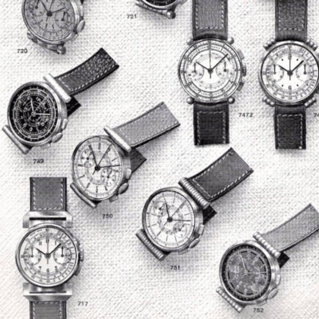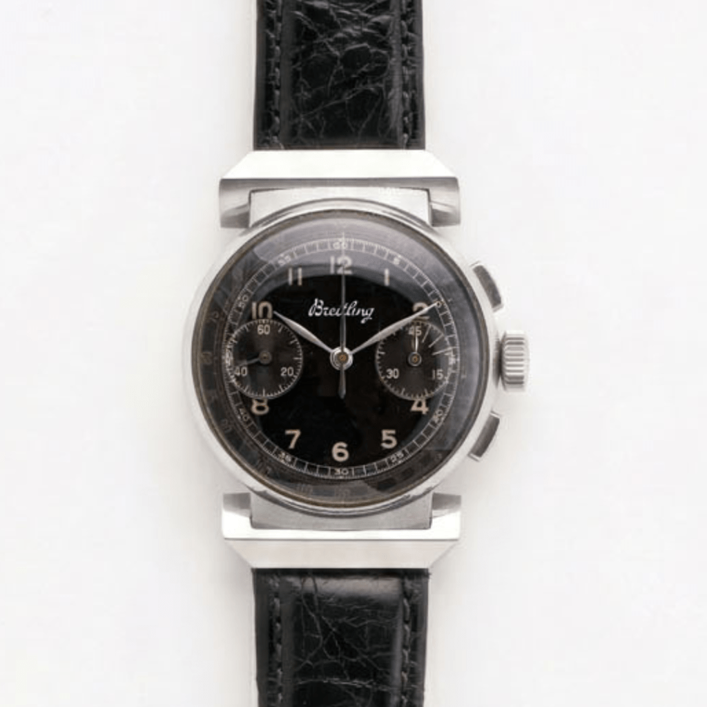 Ce modèle apparaît au catalogue Breitling de 1940 sous la référence 717. Surnommé « Fancy Model », ce chronographe se distingue par un boîtier au design atypique, particulièrement rare dans la production de la maison.