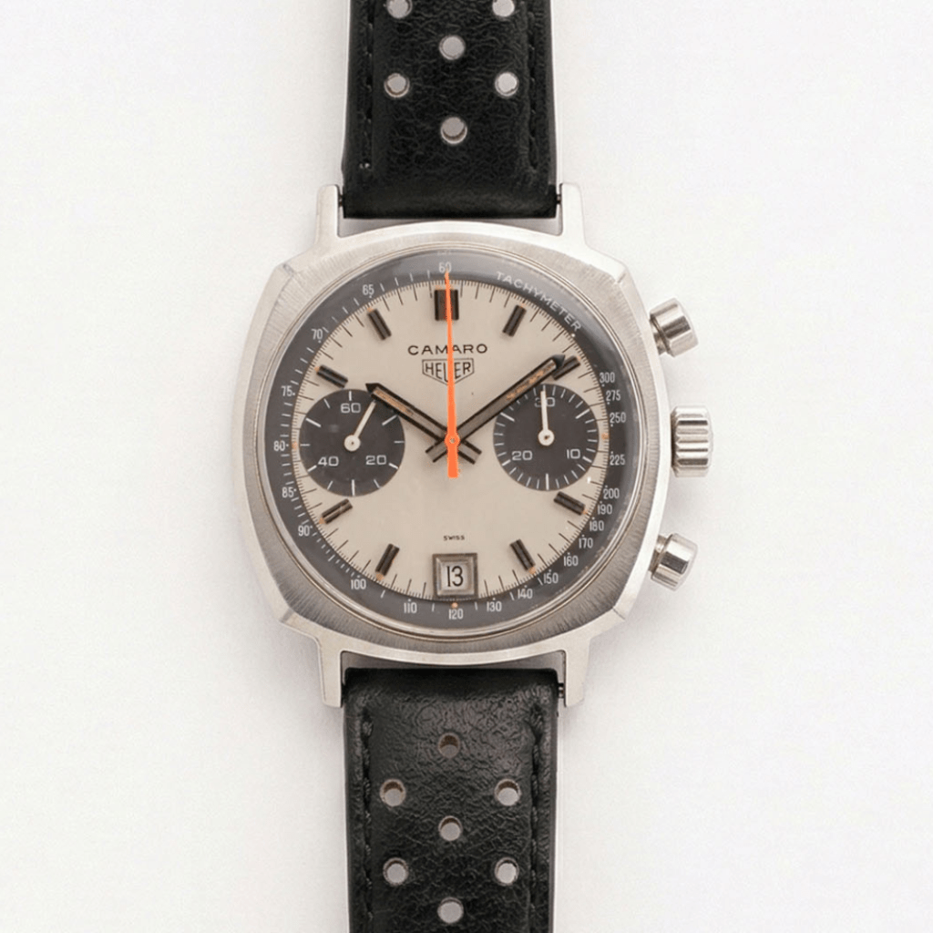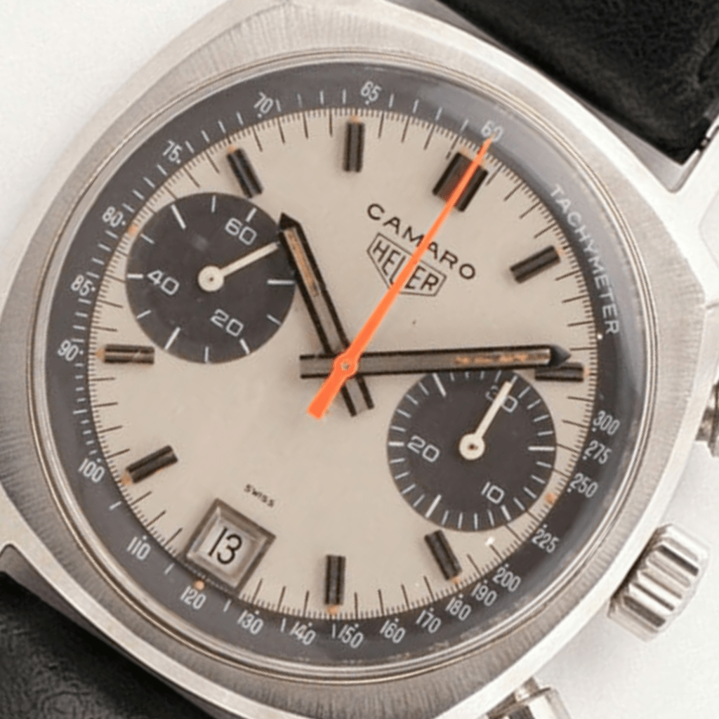 Introduit en 1968, le modèle Camaro est aujourd’hui considéré comme un véritable collector dans l’univers de Heuer. Resté au catalogue pendant seulement 4 années, il se démarque par une production relativement variée : versions avec ou sans date, utilisation de trois calibres Valjoux différents (72, 92 et la famille 773X), ainsi que des cadrans à deux ou trois sous-compteurs.