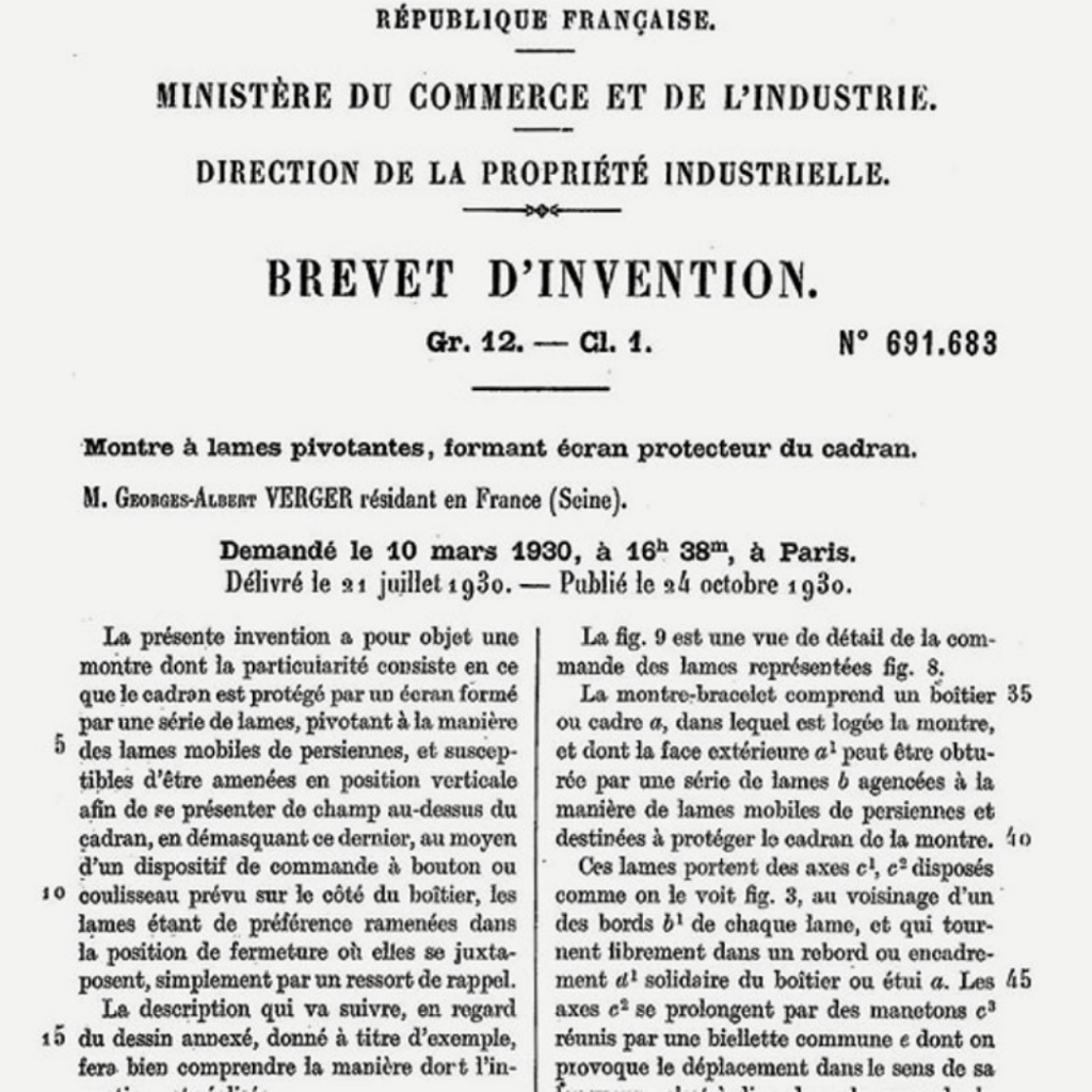 C’est dans ce contexte que Verger Frères imagine cette montre-fermoir aux lignes tranchantes, directement inspirées de la calandre d’une automobile. Transposer un radiateur en bijou horloger : toute l’audace du modernisme tient dans ce geste.